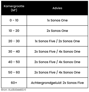 Door het gebruik van omnidirectionele audiotechniek in de Spottunespeakers hoeven er tot 50% minder speakers gebruikt te worden voor goed geluid in een ruimte. Ons advies is om ongeveer één speaker te gebruiken per 75m². Voor Sonos worden andere onafhankelijke adviezen gegeven, zie hieronder. Zoals je ziet heb je meer Sonos speakers nodig voor goed geluid in een ruimte.